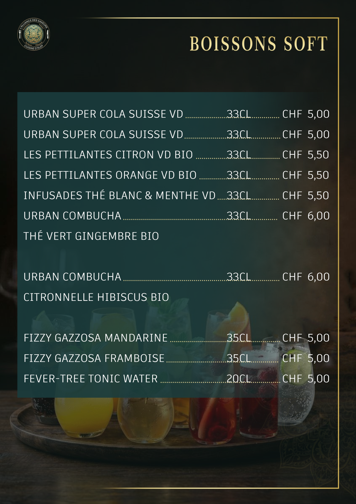 Des boissons bio et suisses, choisies avec soin, sont proposées sur la carte ci-dessous